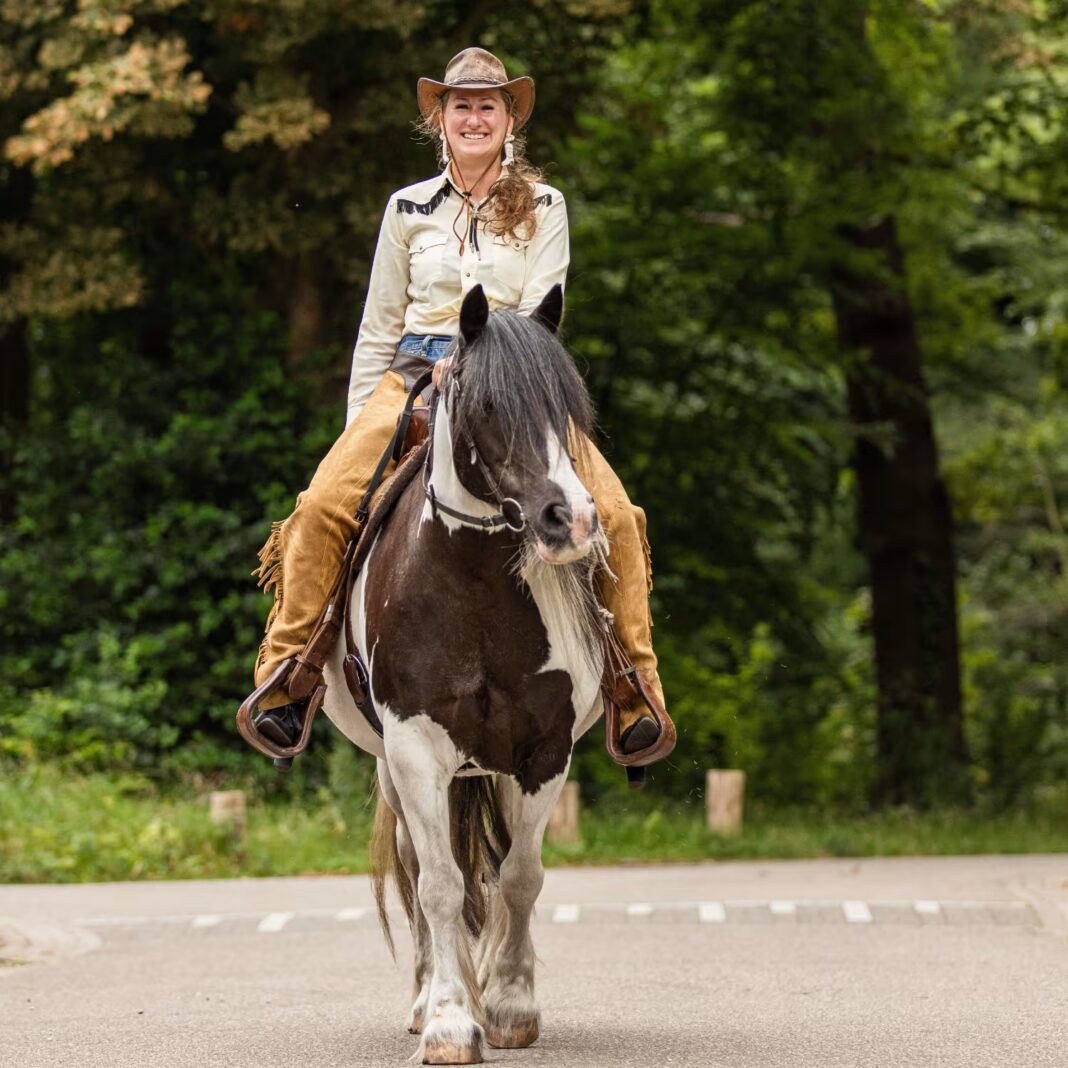 Dat ik deze droom kan verwezenlijken is natuurlijk niet heel waarschijnlijk. Maar gelukkig stap ik na een half uur fietsen op mijn paard Bo in het Panbos en kan onze hond Tommie gewoon in mijn fietskrat mee naar dat spontane wijntje in het centrum. En soms komen er momenten voorbij dat ik écht even mijn innerlijke rancher kan vrijlaten. Zoals tijdens ‘Expeditie Groenekan’, wat onze vrienden Anne en Sander ieder jaar organiseren rondom hun fantastische huis. Afgelopen jaar was het thema ‘Western’ en dus konden Bo en ik richting de Lindenlaan voor een dagje cowboyen.